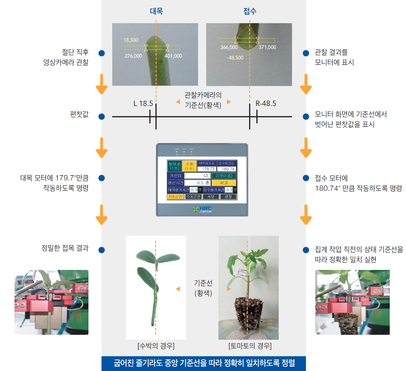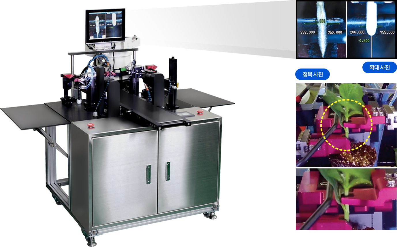 - 비전카메라를 이용하여 기준선에서 벗어난 편차값만큼 구동모터가 회전하므로 정밀한 접목이 가능합니다.
