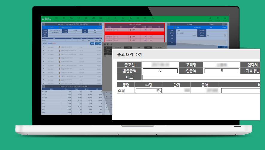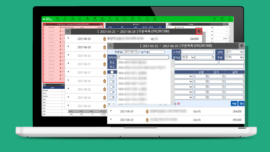 검색된 고객을 클릭하면 주문, 출하, 입금 내역 위젯이 동시 연동하여 정보를 표시 합니다.