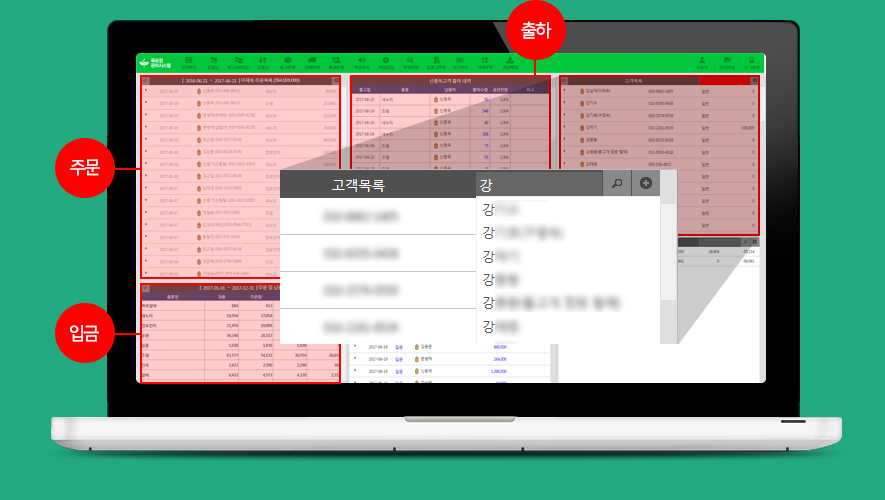 필요한 정보 창들이 화면에 배치되어 있어, 주문을 받으면서 종이에 내용을 쓰듯 입력하면 자연스럽게 창의 내용들이 바뀌면서 필요한 정보가 나타납니다. -