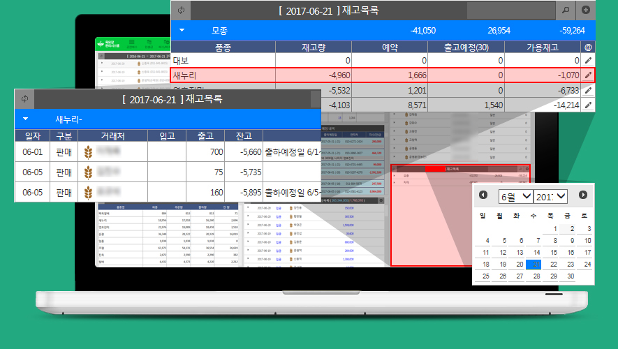 기간을 지정하여 파종, 주문량, 출하량, 잔량을 위젯으로 주문현황을 상시 확인