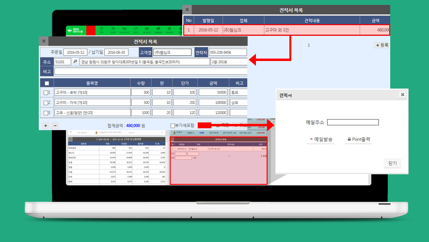 견적이 필요한 경우 견적서를 작성하고 출력하거나 메일로 발송할 수 있습니다.