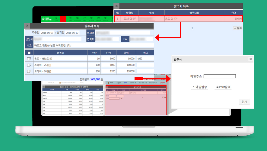 발주서를 등록, 출력하고 목록을 관리할 수 있습니다.