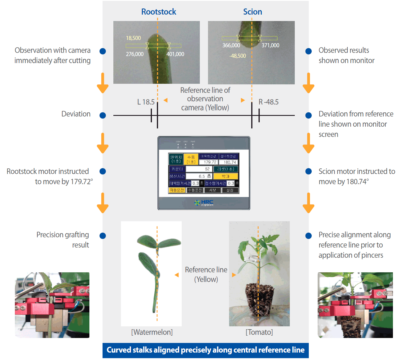 The cross sections of the rootstock and scion are photographed to locate the central line, and the graft position is found with a margin of error within 1/100㎜.